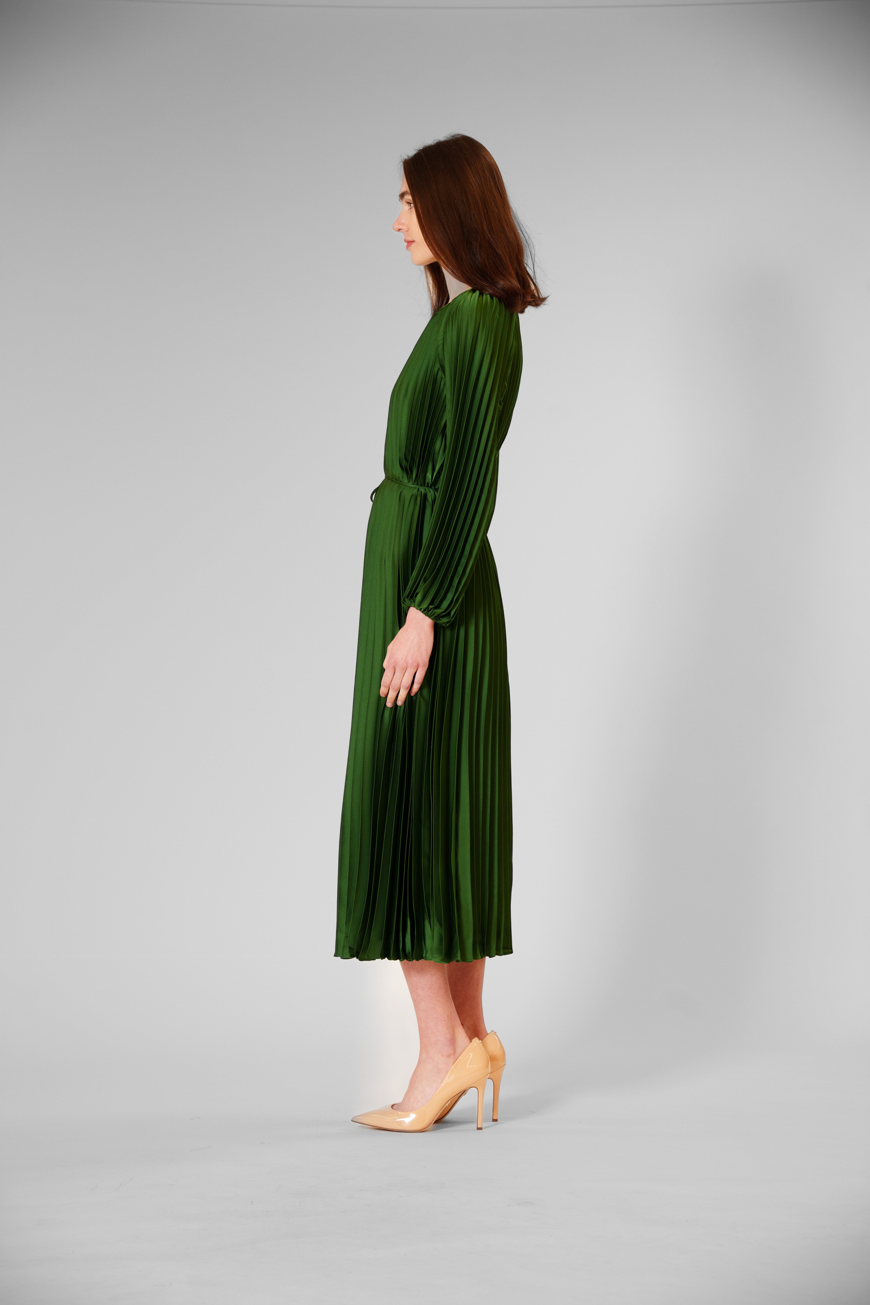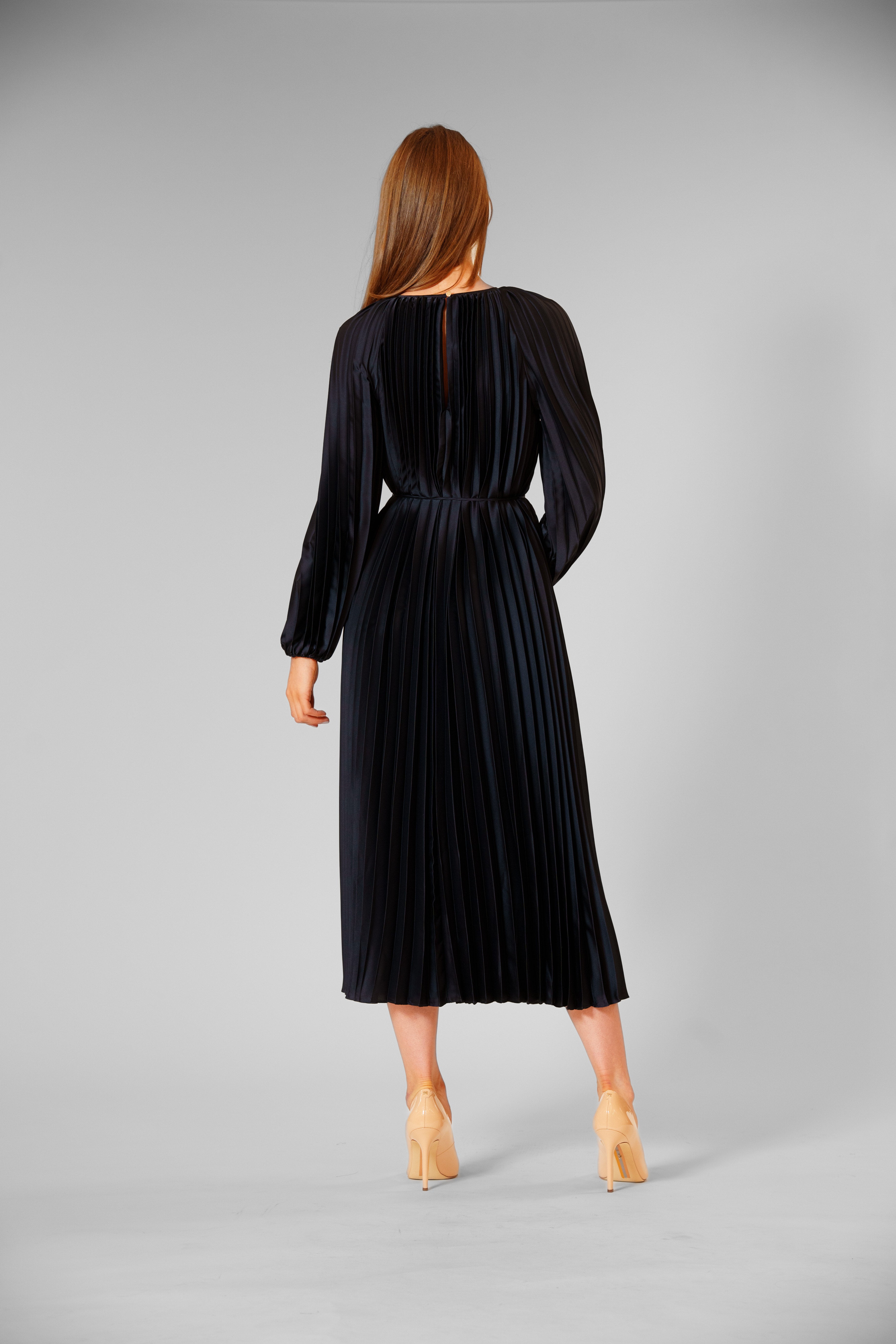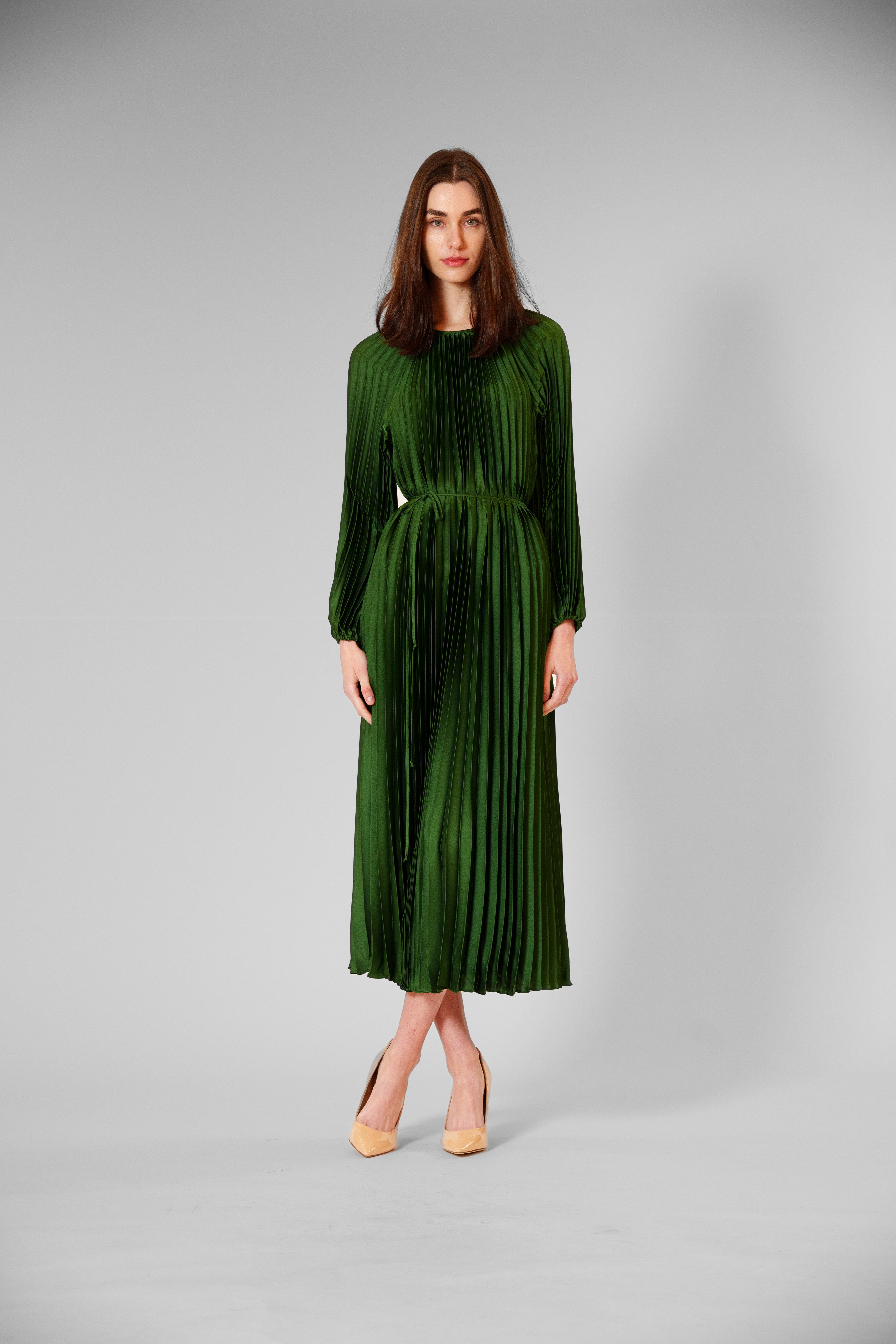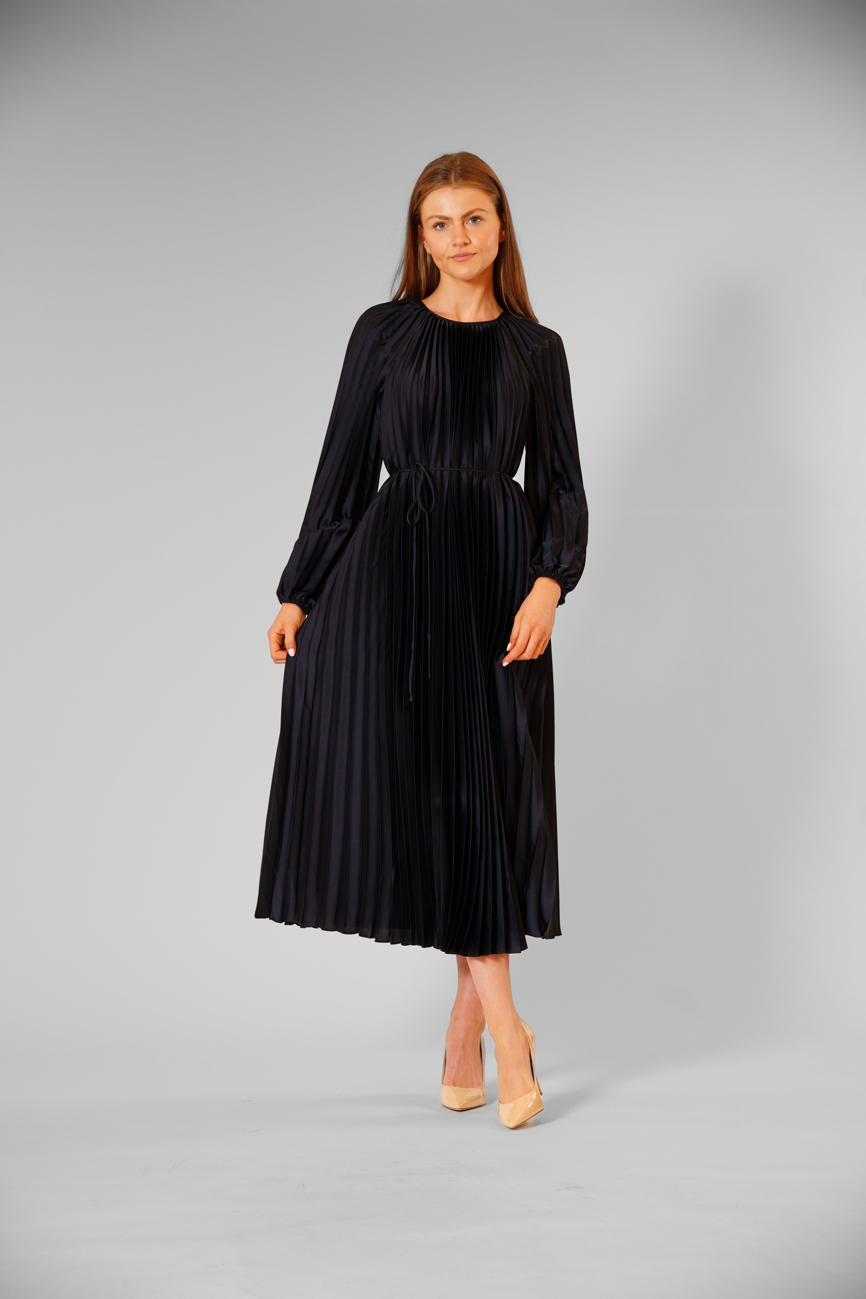 This best-selling pleated satin dress, available in two radiant colors, drapes beautifully in a silky, light-catching fabric with graceful long sleeves, a matching belt and flowing pleats that add movement and elegance—perfect for cocktail parties, evening weddings, upscale dinners, or any event where she wants to feel effortlessly stunning.