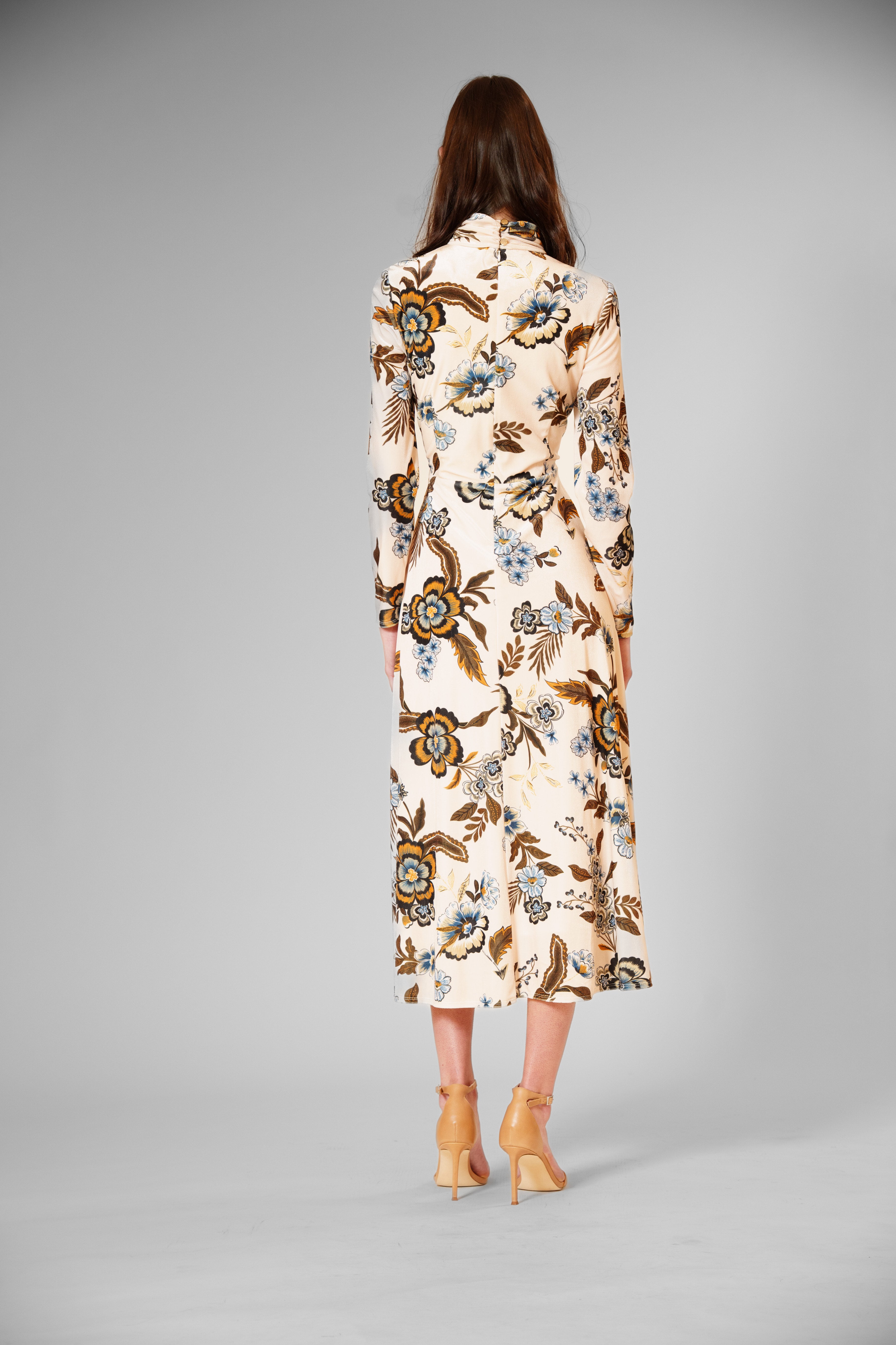 This luxurious printed velvet dress stuns with its creamy base and richly detailed floral patterns in opulent shades of blue, brown, and gold, complemented by refined long sleeves and a graceful high neckline that exude timeless sophistication—making it an impeccable choice for elegant cocktail parties, polished evening dinners, or chic formal gatherings where style and poise are essential.