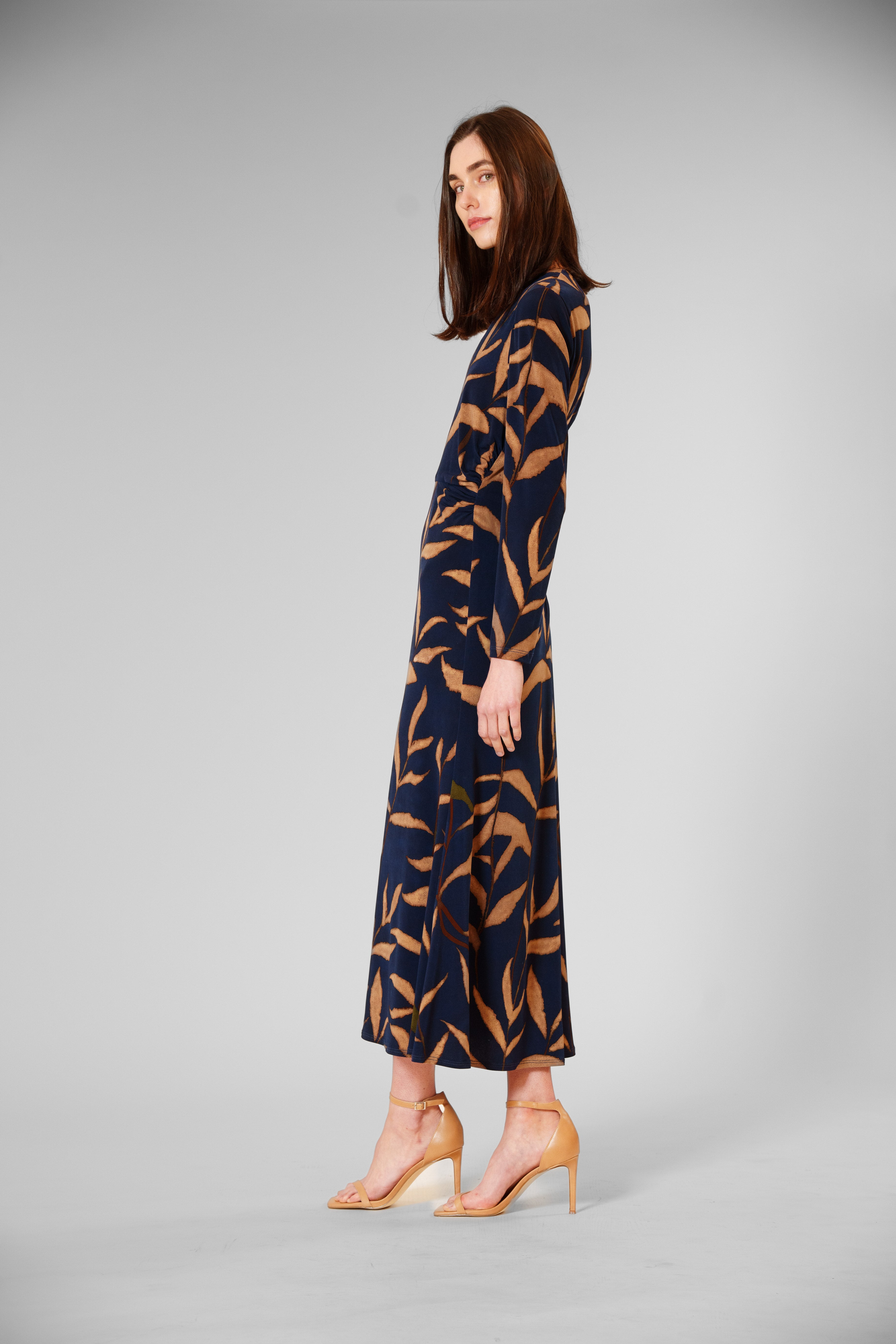 This striking printed jersey dress hugs the body in a beautifully flattering silhouette, with long sleeves and a sleek high neckline, all brought to life by a bold golden leaf pattern set against a rich navy backdrop that radiates elegance, confidence, and effortless style—perfect for chic brunches, stylish evening gatherings, or polished office events.