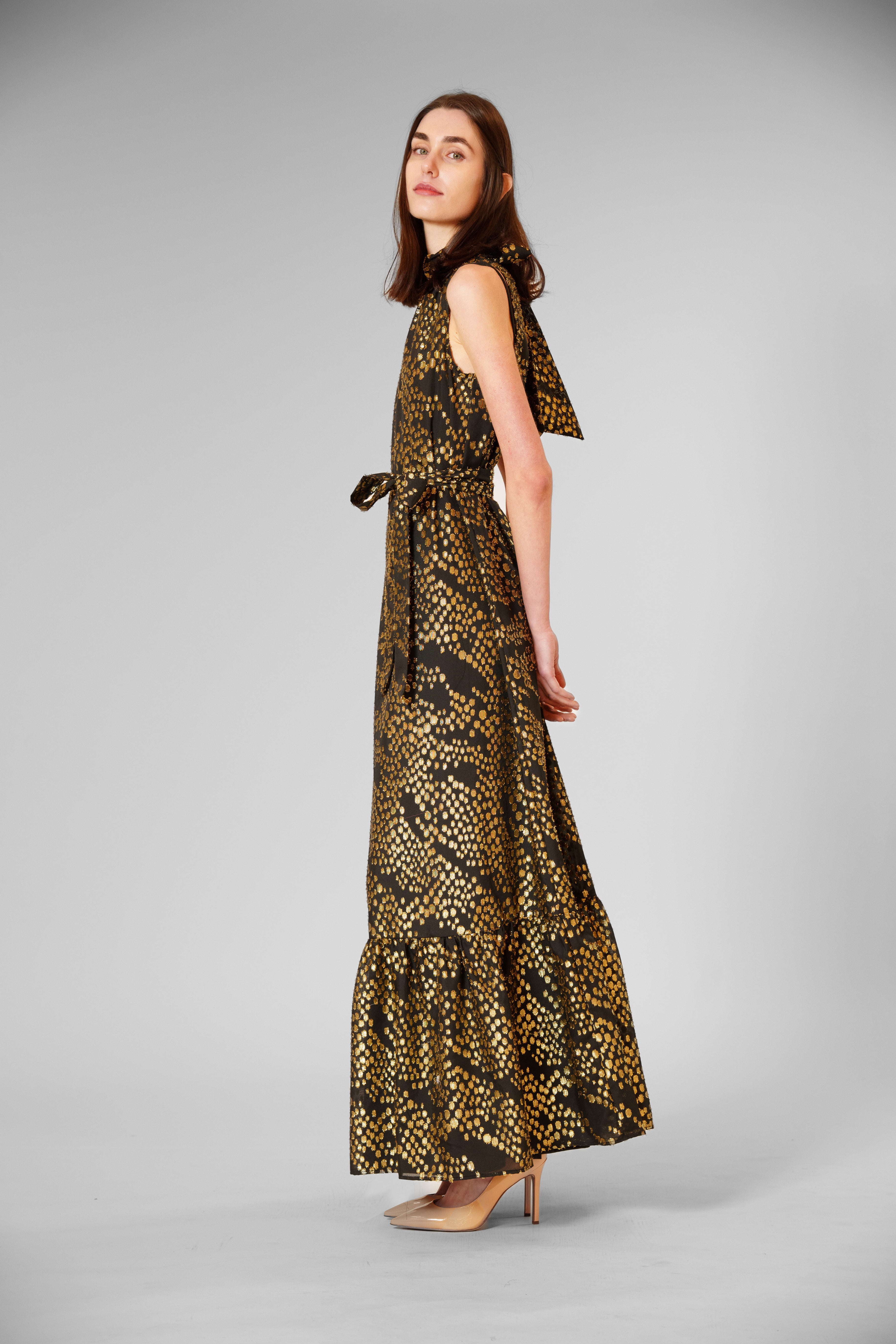 This breathtaking lurex chiffon textured evening gown shimmers with a luxurious gold and black pattern, featuring a graceful high neckline, a waist-cinching sash belt that flatters the figure, and a flowing skirt with delicate ruffled hems—making it an ideal choice for special occasions like weddings,galas, milestone birthday celebrations, or elegant holiday gatherings.