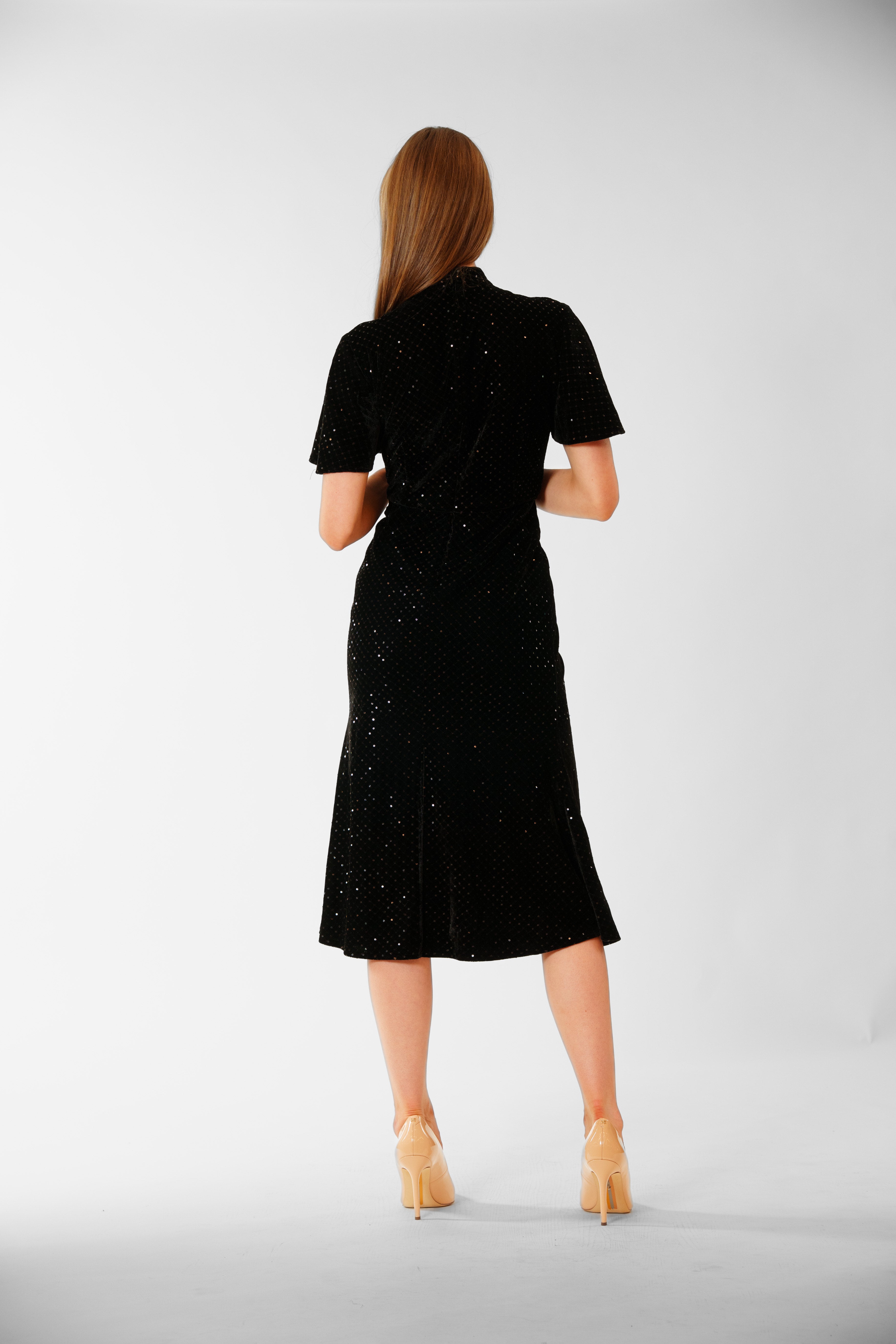 This elegant black velvet dress shimmers with delicate sequin detailing, featuring a refined high neckline, soft flutter sleeves, and a beautifully fitted waist that flows into a graceful A-line skirt—making it a flattering and versatile choice for occasions like a fancy dinner date, a holiday party, a theater night, or a stylish evening out with friends.