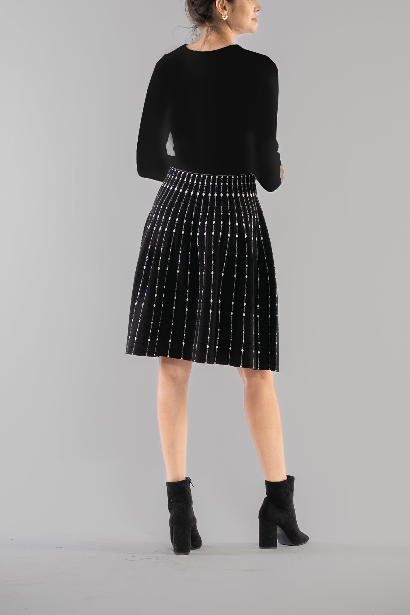 Cozy yet refined, this long sleeve scoop neck sweater dress combines a sleek ribbed bodice with a strikingly patterned skirt, offering a harmonious blend of texture and structure that’s effortlessly chic, subtly bold, and perfect for elevating everyday style with a touch of modern sophistication.