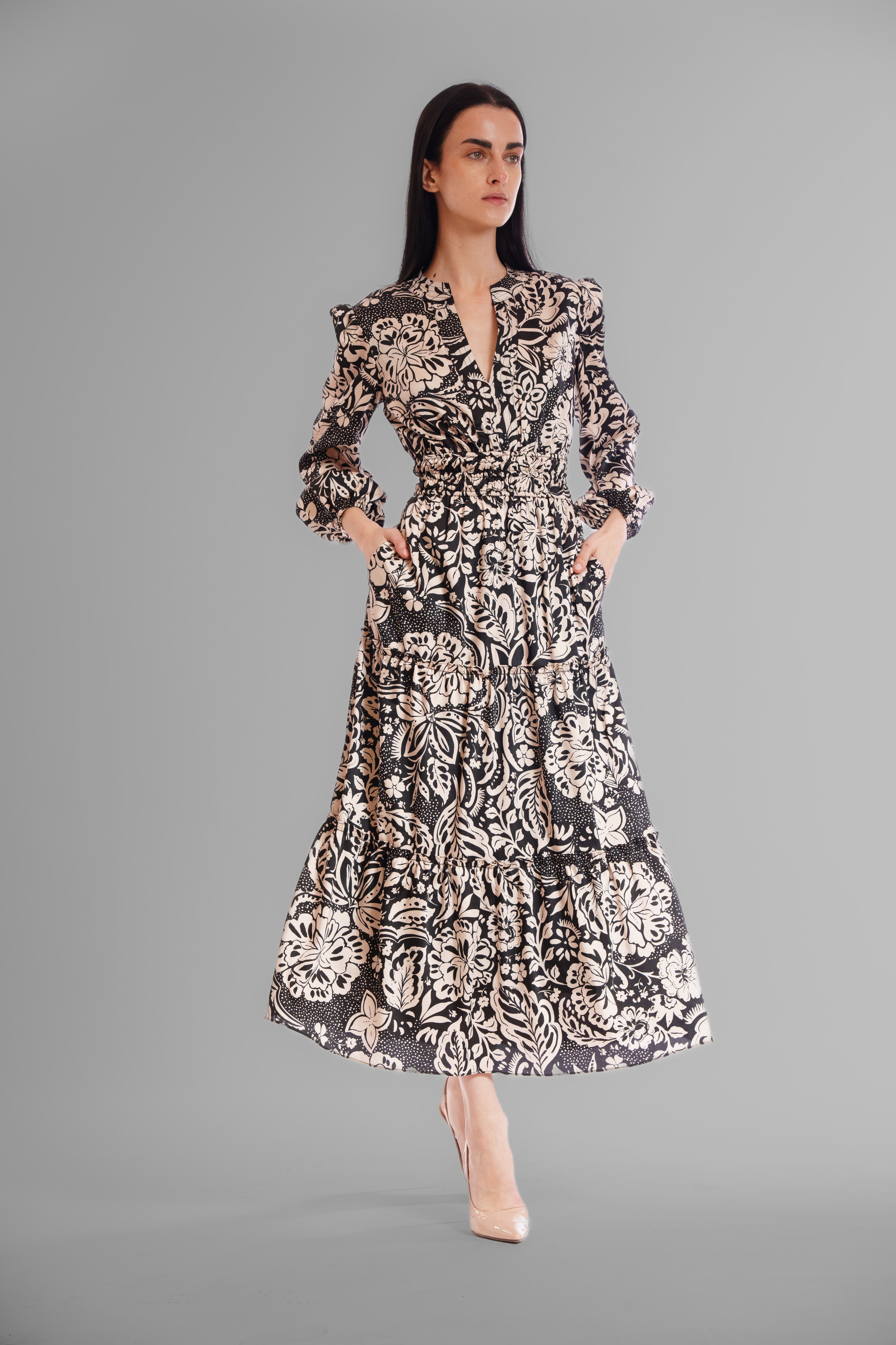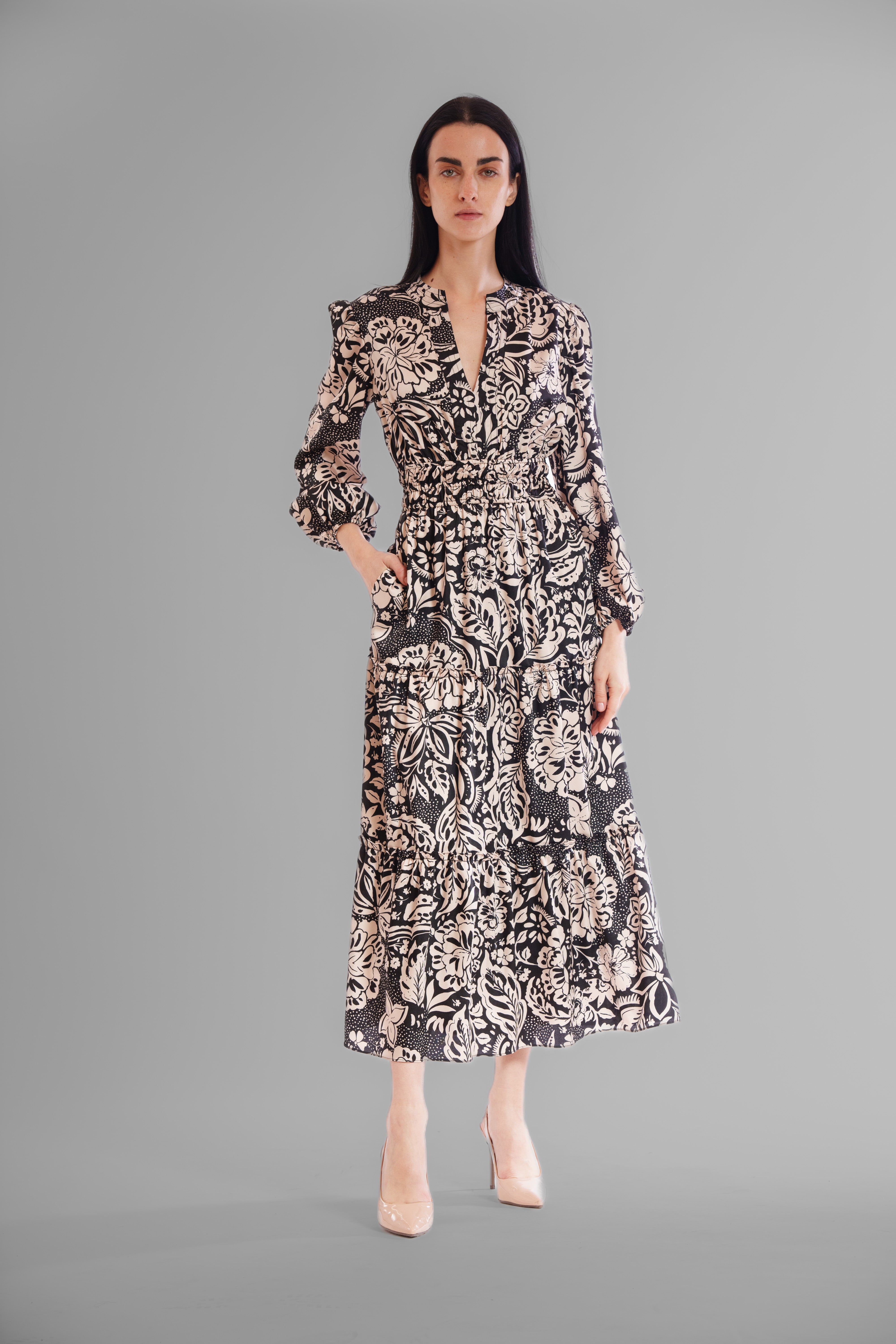 Romantic, flowy, and effortlessly graceful, this long sleeve V-neck dress enchants with its delicately tiered silhouette, flattering elastic waist, and intricate detailing, offering a dreamy blend of bohemian charm, feminine elegance, and all-day comfort that moves beautifully with every step.