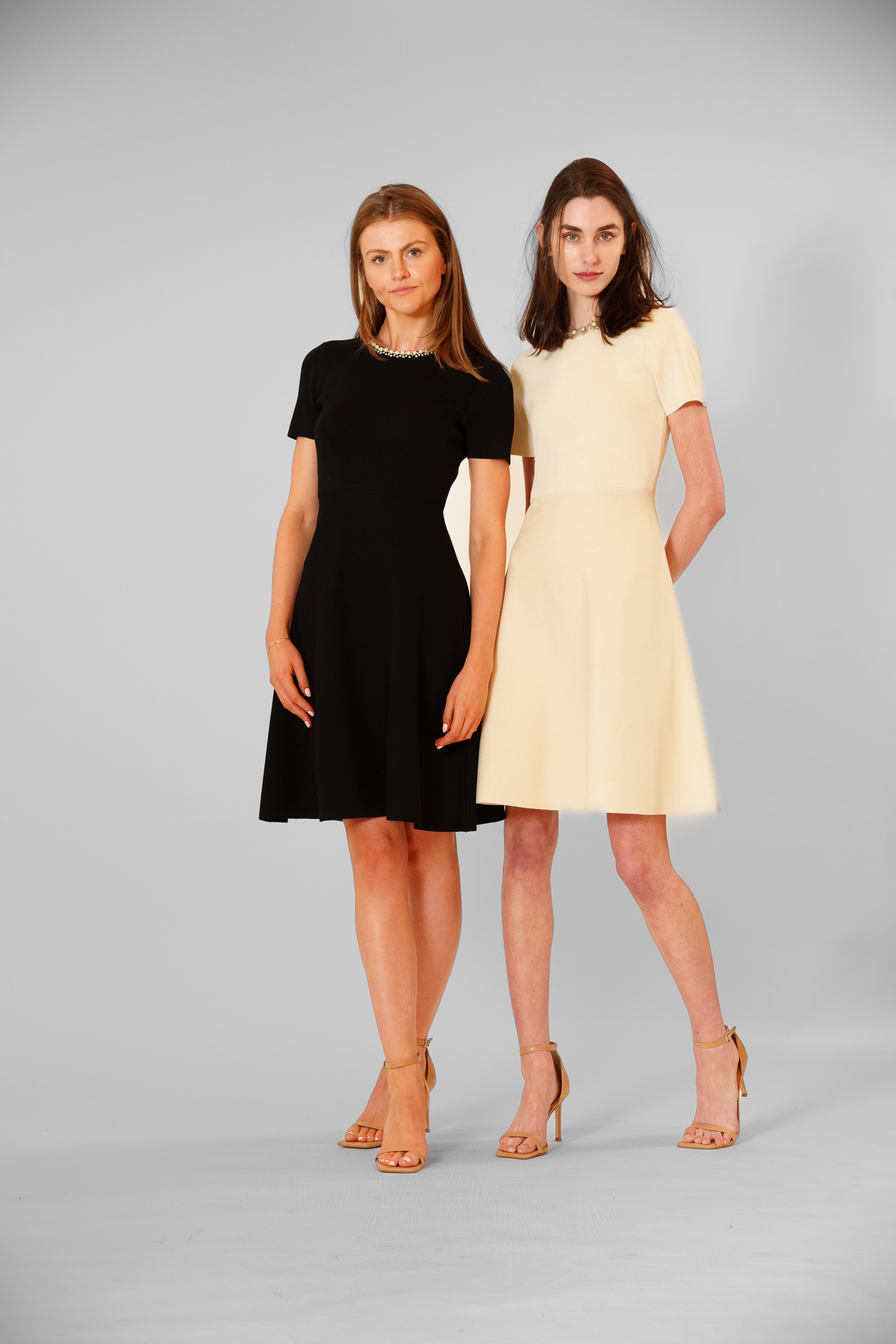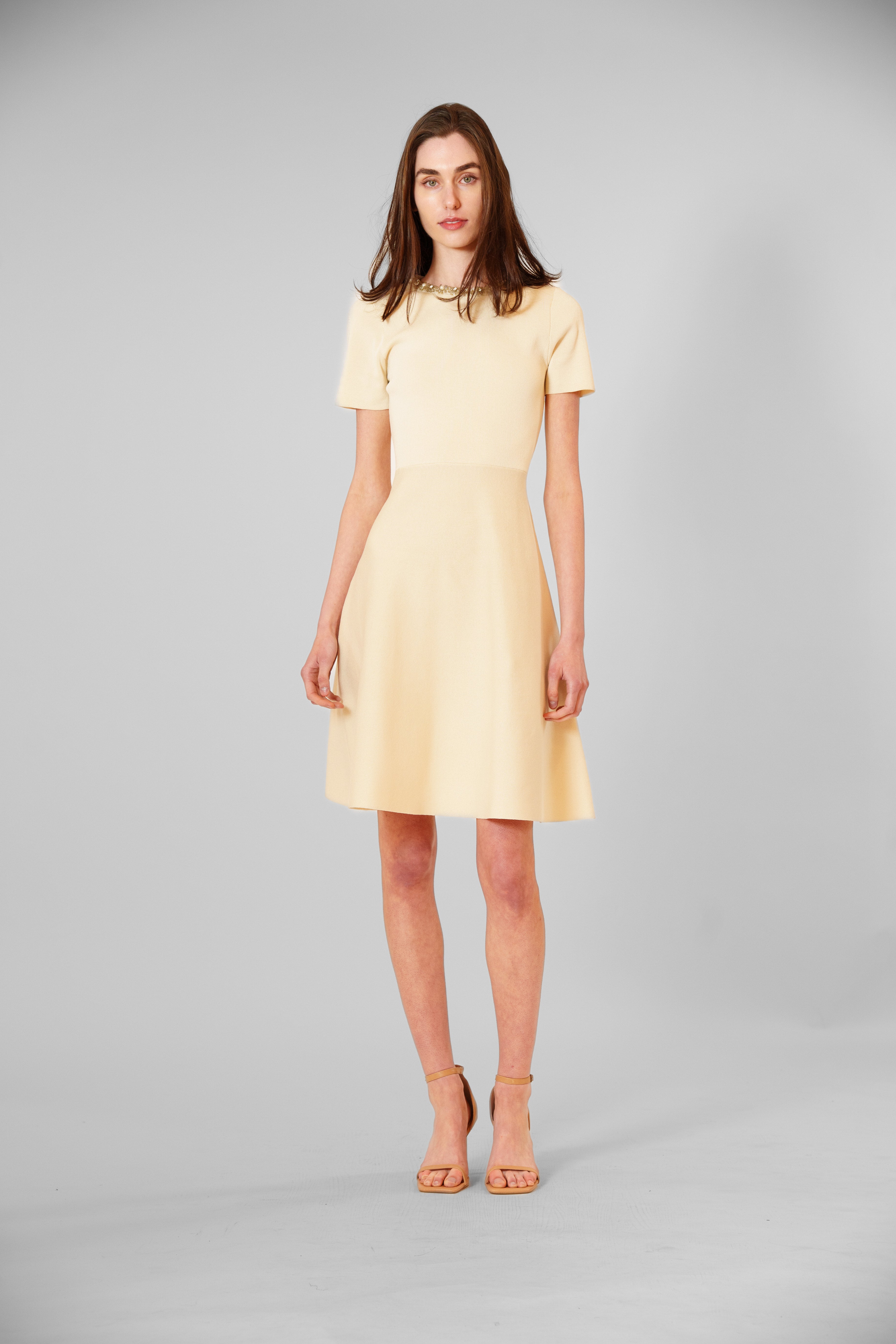 A smooth, stretch-kissed, bodice-hugging, skirt-flaring, neckline-framing, trim-accented short sleeve dress—perfect for polished daytime wear, gallery-hopping afternoons, or effortlessly elevated weekend outings, blending comfort, charm, and modern femininity in every stitch.