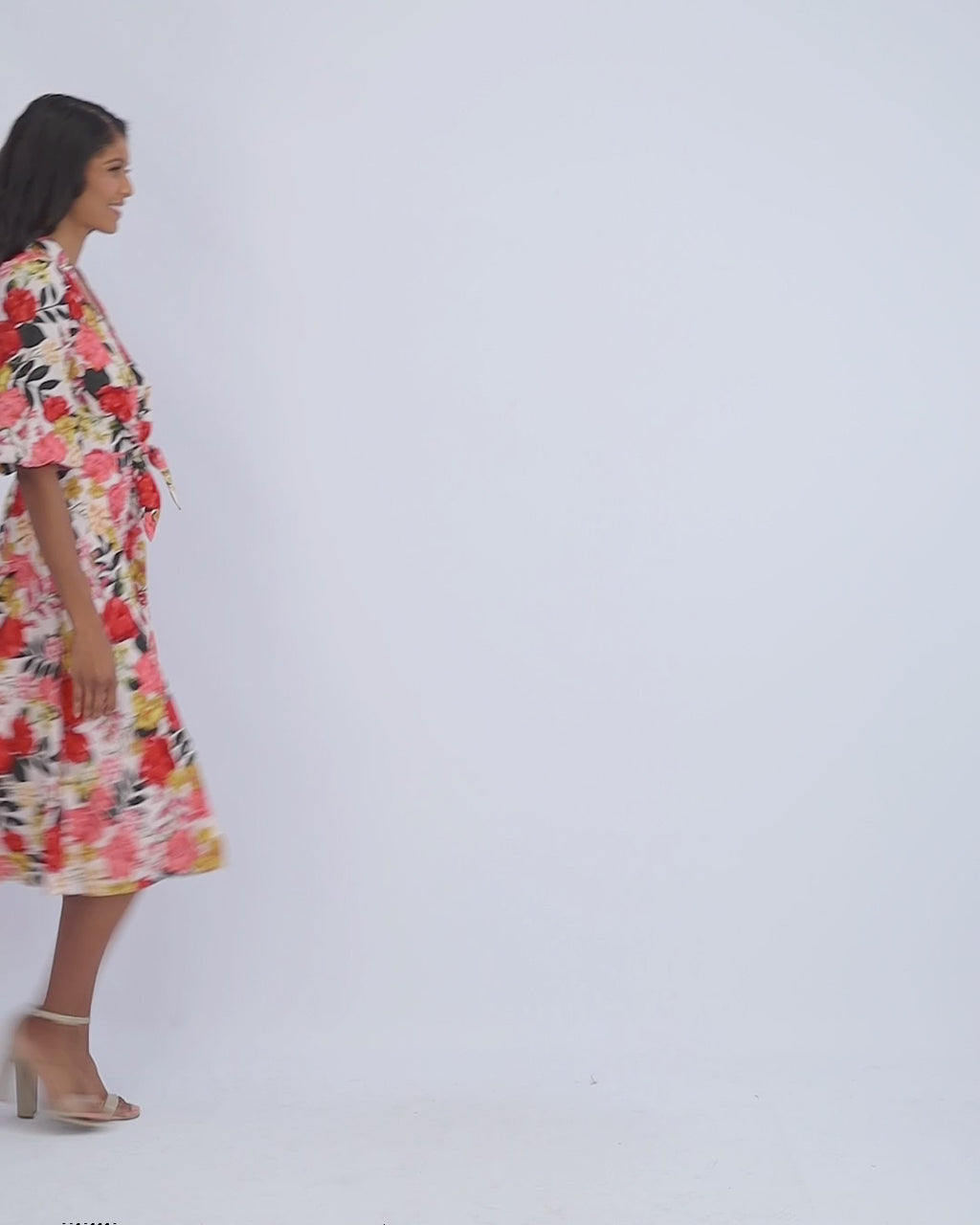 Fresh, feminine, and effortlessly graceful, this sleeve tie front midi dress features a vibrant floral pattern, a flattering wrap-style V-neckline, and charming three-quarter sleeves finished with delicate tie accents, all flowing into a breezy mid-calf skirt that captures the essence of romantic elegance and carefree sophistication—perfect for garden parties, brunch dates, or any moment that calls for a touch of blooming beauty.