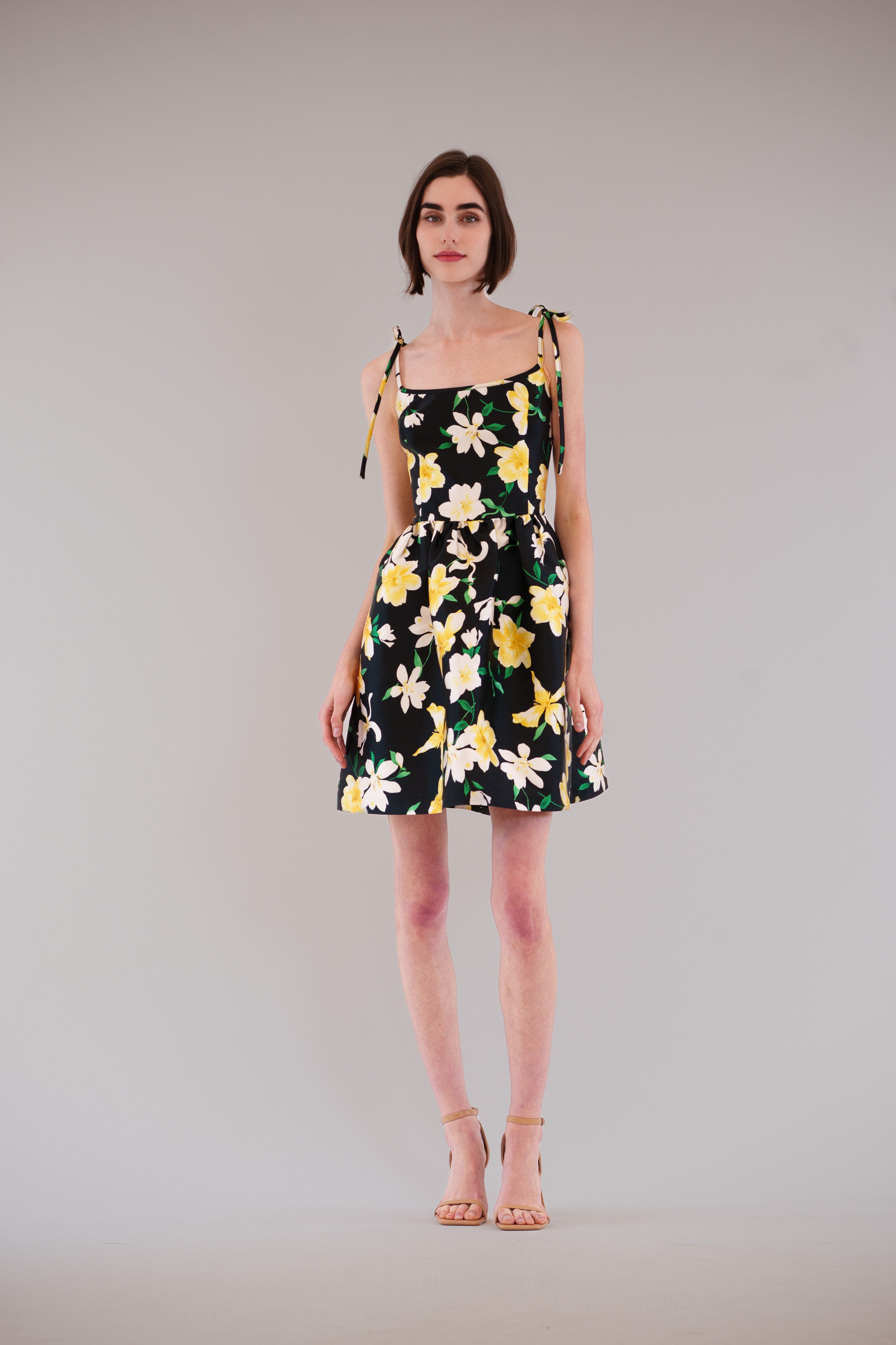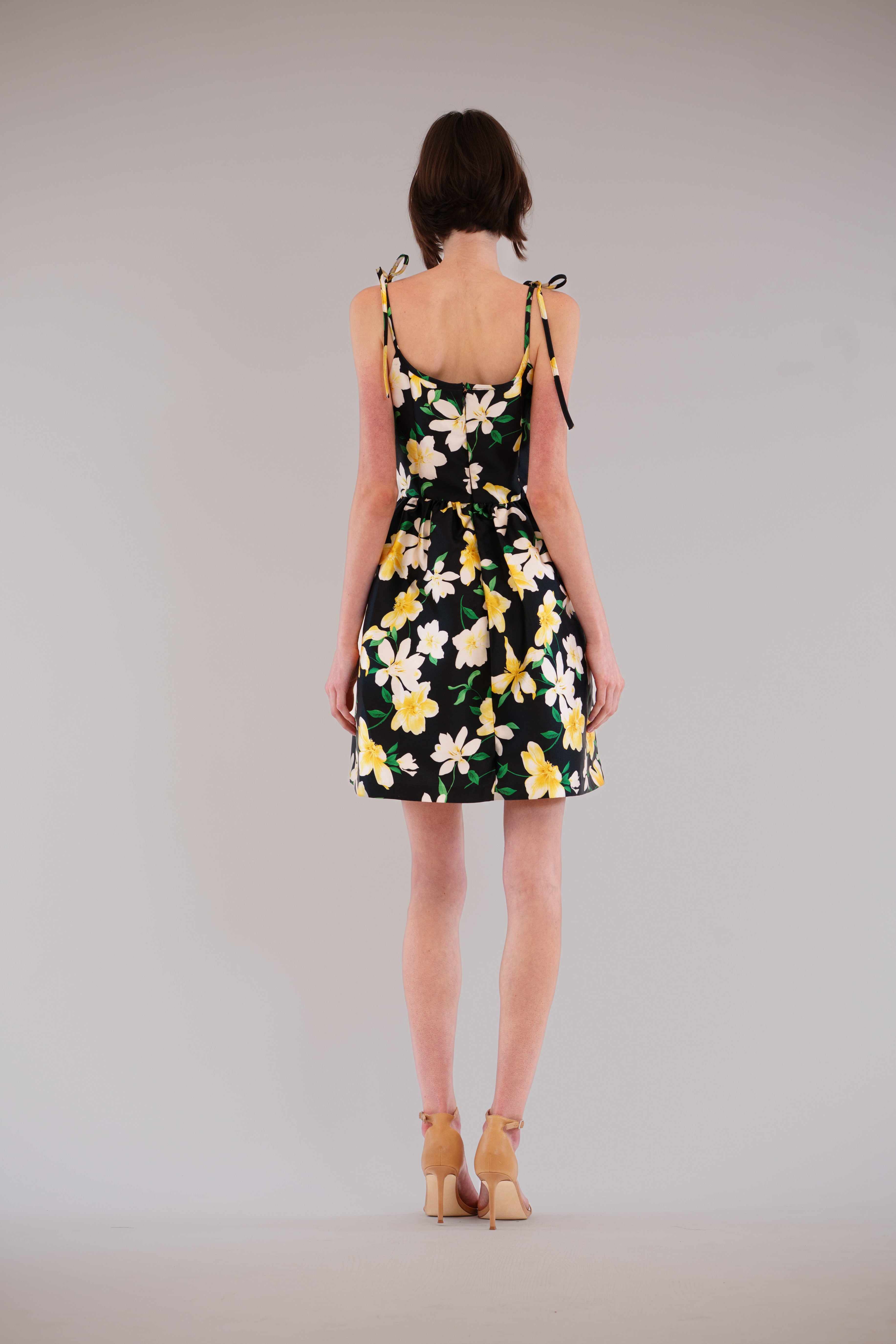 This printed twill mini cocktail dress stuns with its delicate shoulder bows, curve-enhancing fitted bodice, and flouncy skirt blooming with bold yellow and white florals against a sleek black backdrop—radiating playful elegance and confident charm for occasions like rooftop dinners, birthday celebrations, date nights, or a night out with friends that calls for something unforgettable.