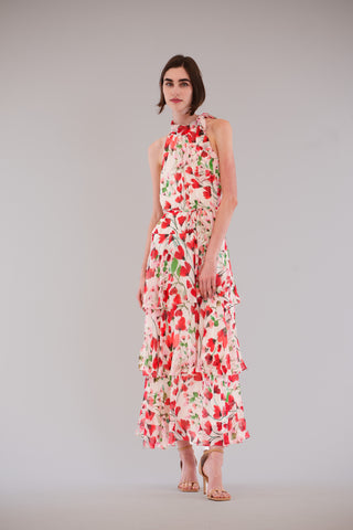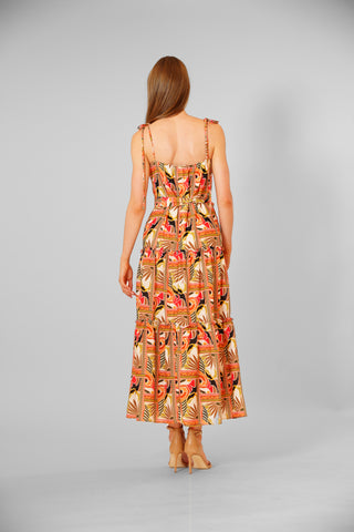 TIE SHOULDER SLEEVLESS RUFFLE MAXI DRESS