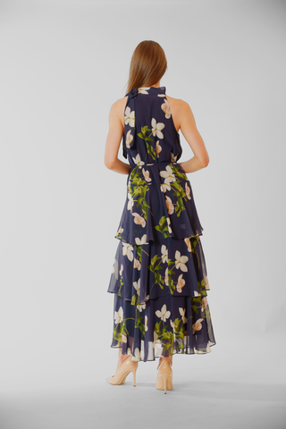 TIE SHOULDER SLEEVLESS RUFFLE MAXI DRESS