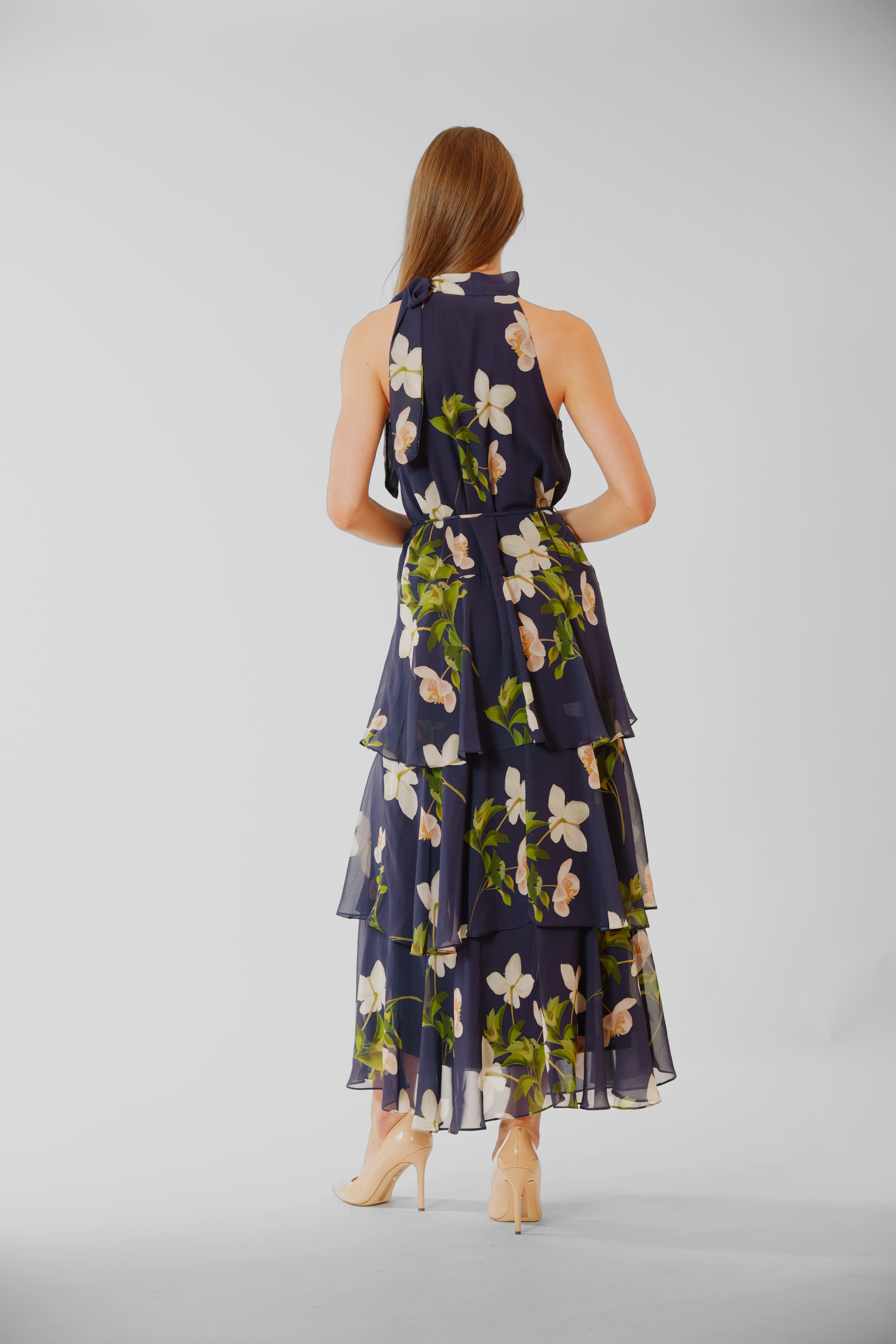 This best-selling triple tier maxi dress, now in a romantic new chiffon print, stuns with its softly pleated tiers, graceful tie neckline, and dainty spaghetti strap belt that cinches the waist just so—radiating elegance and effortless femininity for daytime celebrations, outdoor receptions, or sipping prosecco under string lights.